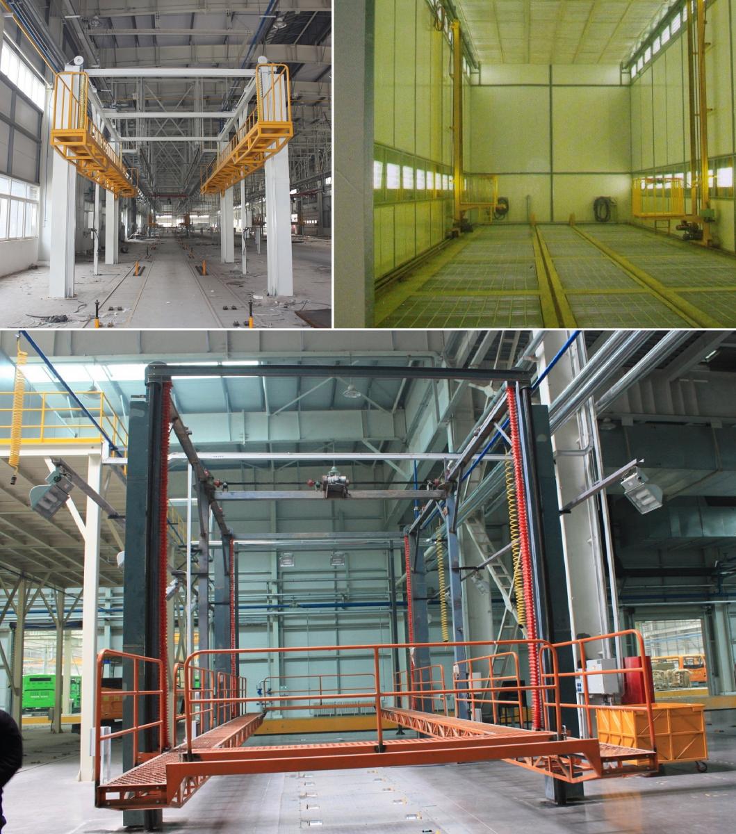 Особенностью обеих линий является то, что кузова (автобусы) и бетоносмесители перемещаются по конвейеру не на своем шасси, а с помощью специальных механизмов.